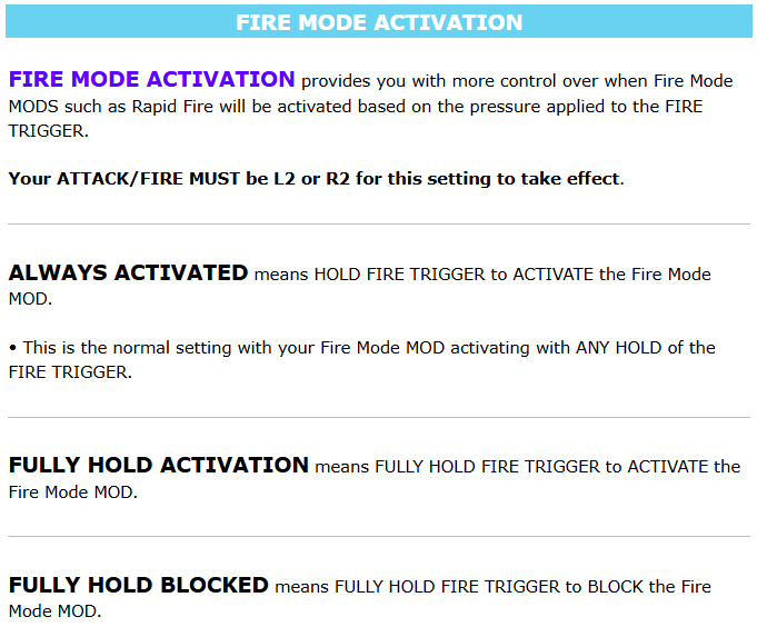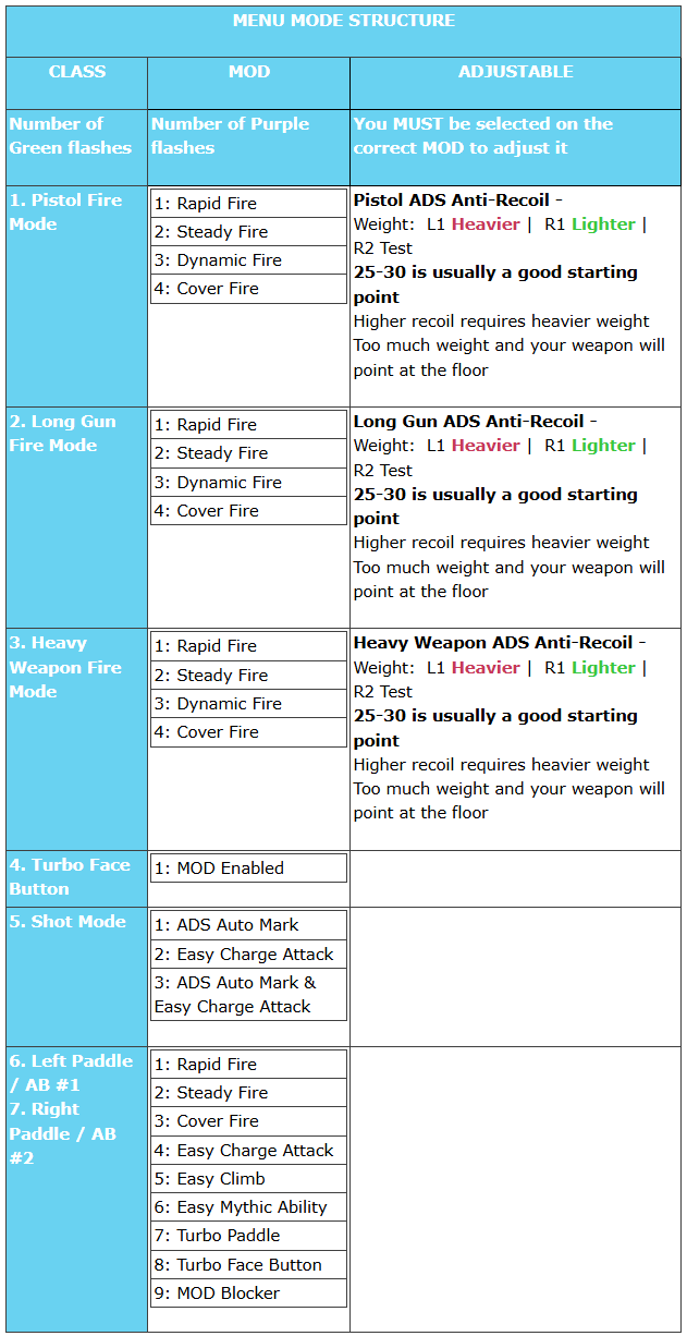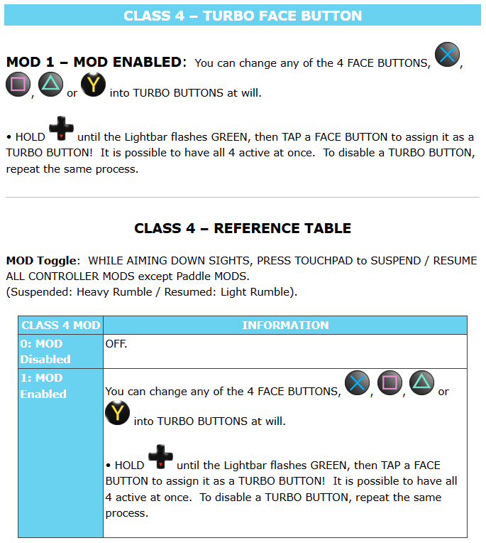 {% hint style="info" %} <mark style="color:blue;">**PS4**</mark><mark style="color:blue;">®:</mark>  To enter Menu Mode, <img src="https://content.gitbook.com/content/5Pbu0ytXByfDjSSpsNex/blobs/a1rU3M3zQ35D9H4Qkcsr/hold.png" alt="" data-size="line">**HOLD** <img src="https://content.gitbook.com/content/5Pbu0ytXByfDjSSpsNex/blobs/biL6sJdtwmqmdQuOtLsl/ps_dpad_left.png" alt="" data-size="line">**LEFT D**-**PAD** for at least 5 seconds, and remain <img src="https://content.gitbook.com/content/5Pbu0ytXByfDjSSpsNex/blobs/a1rU3M3zQ35D9H4Qkcsr/hold.png" alt="" data-size="line">**HOLDING** <img src="https://content.gitbook.com/content/5Pbu0ytXByfDjSSpsNex/blobs/biL6sJdtwmqmdQuOtLsl/ps_dpad_left.png" alt="" data-size="line">**LEFT D**-**PAD** to stay in Menu Mode: